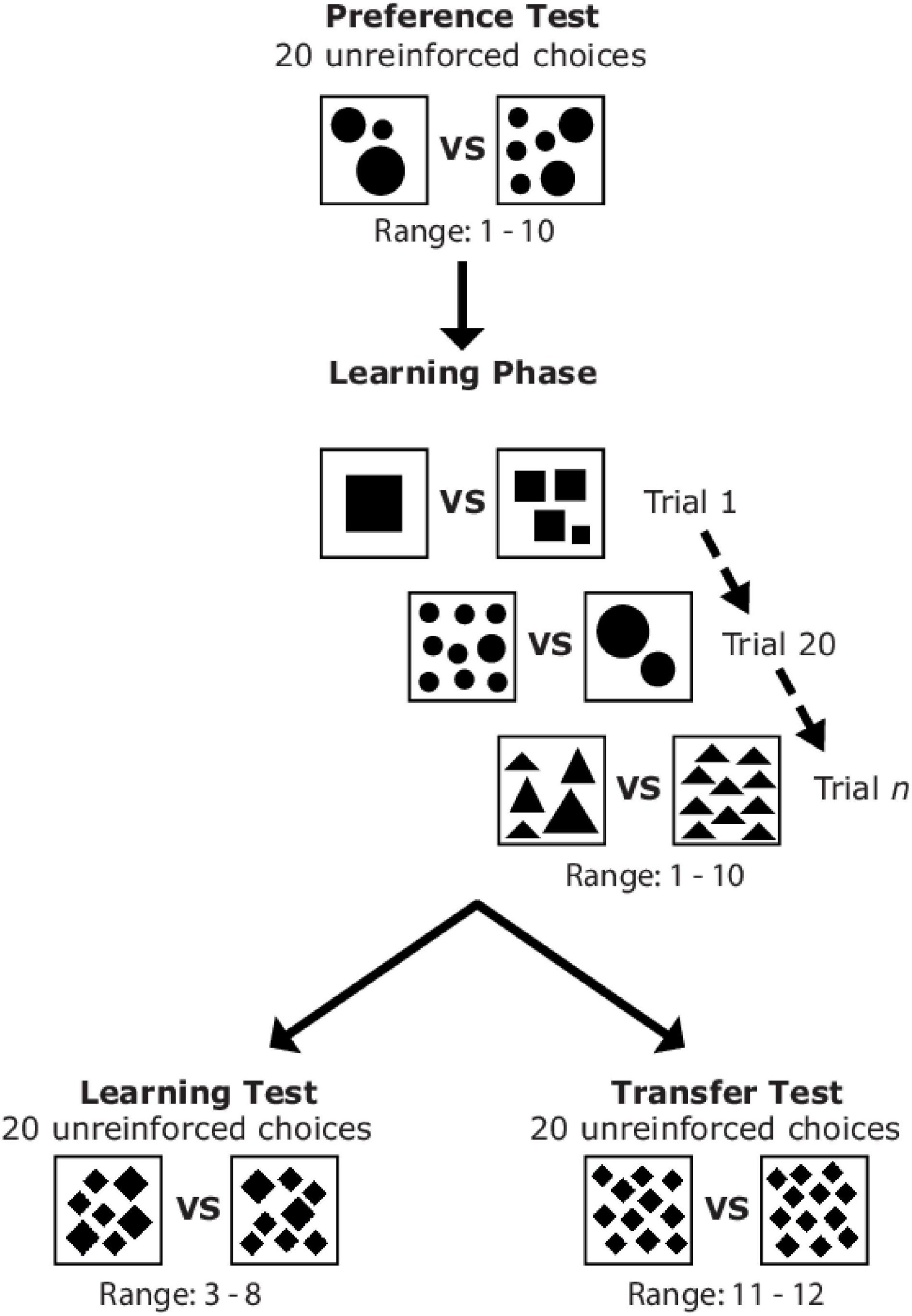 The authors of this study evaluated whether: 1) free-flying honeybees could be trained to differentiate between odd and even numbers of geometric shapes, and 2) whether they could transfer this learning to new situations. Bees were initially trained to prefer odd or even numbers of shapes by associating stimuli (cards with 1-10 shapes) with either sugar or quinine. After training, each bee participated in 20 learning-test trials in which they made a choice between stimuli with an even or odd number of shapes. These trials again used stimuli with between 1 and 10 shapes. Lastly, each bee also participated in 20 transfer-test trials where they chose between stimuli consisting of either 11 or 12 shapes. The full experimental design is illustrated in the figure below and more details can be found in the paper if you are interested.